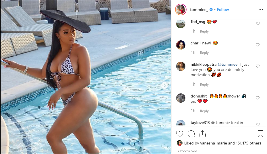 Reality star Tommie Lee set tongues a-wagging yet again with her latest “thirst trap” on social media, sending fans into a frenzy. The “ Love and Hip Hop: Atlanta ” alum wowed this week in a barely-there leopard print bikini, putting her round rump on full display. A dark black fascinator adorned her head as she stepped gracefully out of the pool. Tommie Lee, 35, sends fans swooning with latest Instagram post. (Photo: @Tommiee_ / Instagram) “It Ain’t Gone Neva stop…” Lee captioned the post, which had racked up over 150,000 likes as of Saturday. Fans, in awe of her beauty, wasted no time flooding her page with compliments. “Damnnnn Tommie